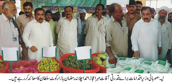 لیہ (لیہ نیوز)پنجاب حکومت کے صوبے بھر میں 9ارب روپے کے تاریخی رمضان پیکج کے تحت 318سستے و رمضان بازاروں میں صارفین کو مارکیٹ سے کم نرخوں پر اشیاء خورد نوش کی فراہمی عام آدمی کو معاشی ریلیف کی جانب اہم عملی پیش رفت ہے ،یہ بات صوبائی وزیر اقدامات براے قدرتی آفات مہر اعجاز احمد اچلانہ نے سستے رمضان بازار کوٹ سلطان کے معائنہ کے موقع پر کہی ۔انچارج سستا رمضان بازار نائب تحصیل دار محال محمد یونس ہنجرا،وائس چیئرمین مہر سعید اچلانہ ،مجیب خان ،حسیب خان گورمانی ،عمران اچلانہ موجود تھے۔صوبائی وزیر نے آٹے ،چینی ،دالوں ،کچن ایٹمز ،مشروبات کے سٹالوں کا معائنہ کیا اور سیکورٹی انتظاما ت کا جائزہ لیا ۔اس موقع پر بتایا گیا کہ آٹا ،چینی ،چنے کی دال،بیسن ،سیب ،کیلے ،کھجور،گھی ،کوکنگ آئل ،گوشت ،انڈے ،تازہ سبزیاں ودیگر اشیاء خورد نوش مارکیٹ سے کم نرخوں پر فراہم کیے جار ہے ہیں ۔(لیہ نیوز)صوبائی وزیر نے مارکیٹ کمیٹی کے حکام کو تمام اشیائے خورد نوش کی فراہمی کو یقینی بنانے کی ہدایت کی۔